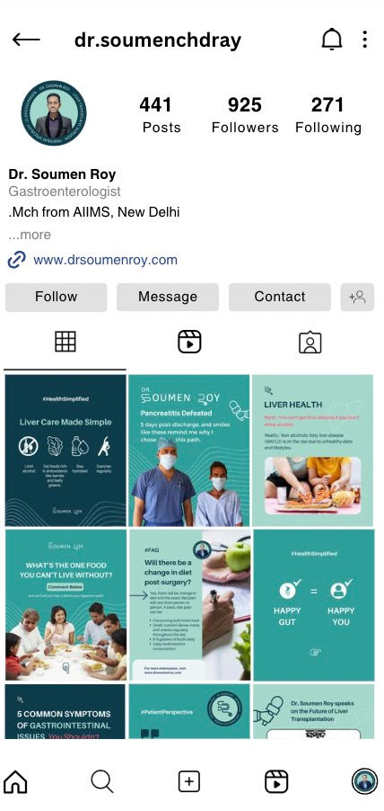 The primary objective was to build digital trust and credibility through informative, relatable, and visually cohesive content. By highlighting awareness posts, informative reels and the doctor’s professional milestones, we aimed to position Dr. Soumen Roy as a thought leader in liver, pancreas and gastrointestinal care — creating a meaningful connection with both patients and the wider healthcare community.
