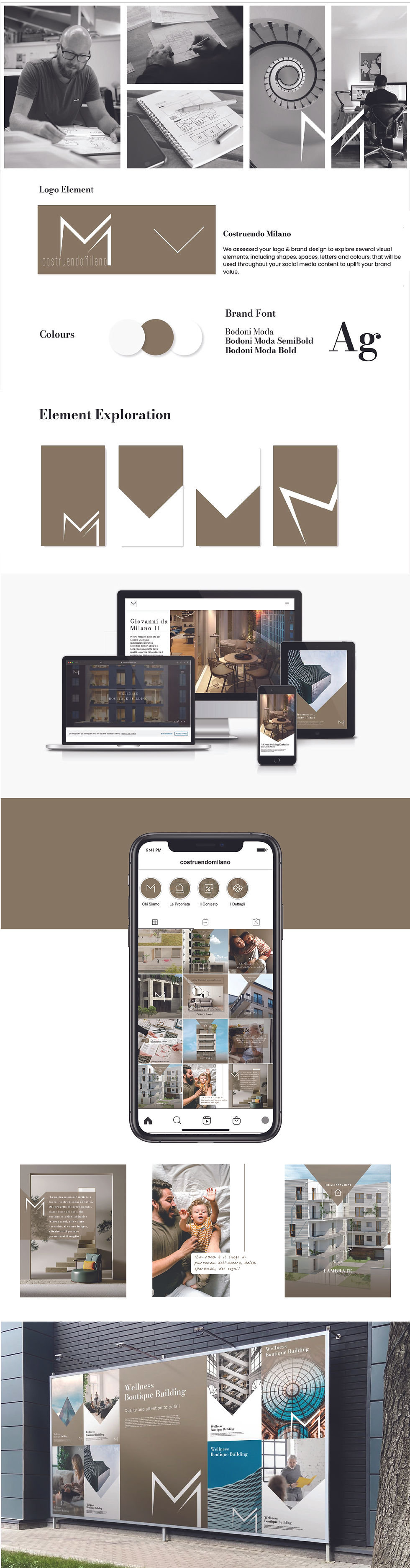 Costruendo Milano, a luxury real estate and architectural brand in Milan, blends timeless Italian design with modern innovation. The branding kit captured this fusion through minimal elegance, architectural balance, and emotionally rich visuals which reflects the brand’s commitment to craftsmanship, functionality, and lifestyle refinement.